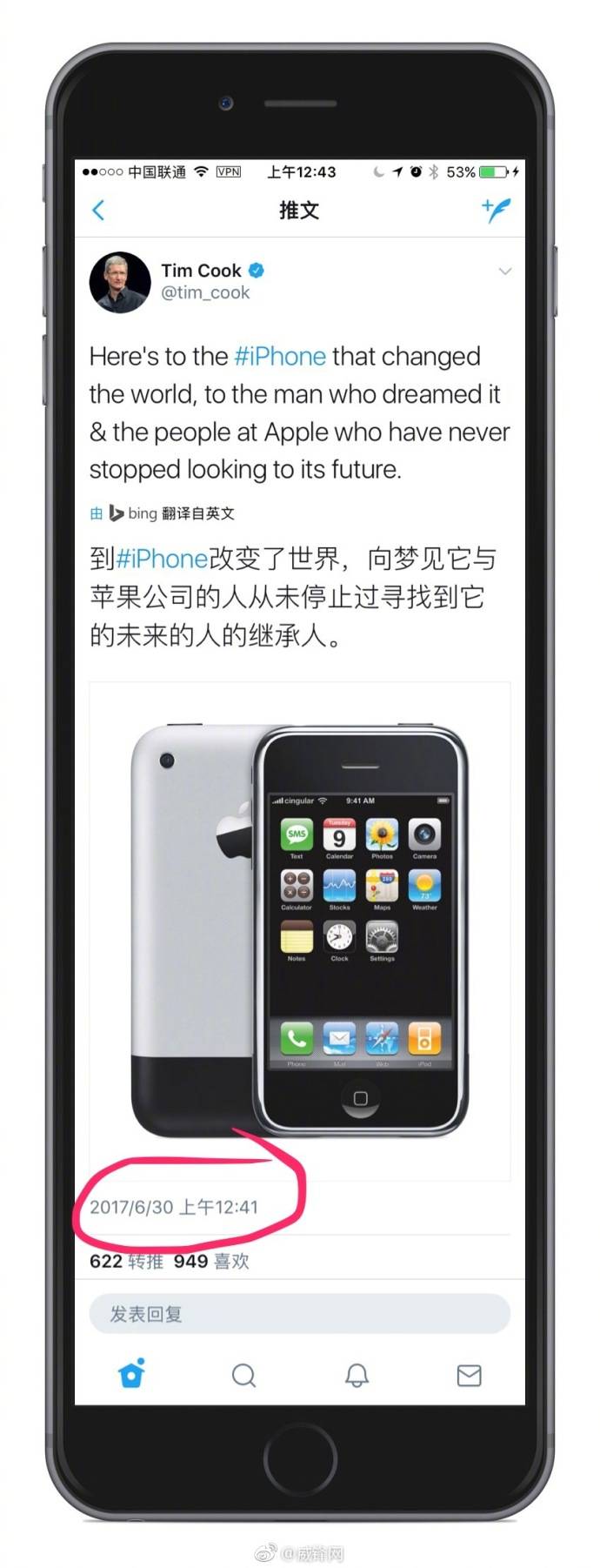 @威锋网:库克大厨@TimCook 刚发了条纪念#iPhone十周岁#的推特,时间刚刚好是美国旧金山那边的6月29日9点41分。