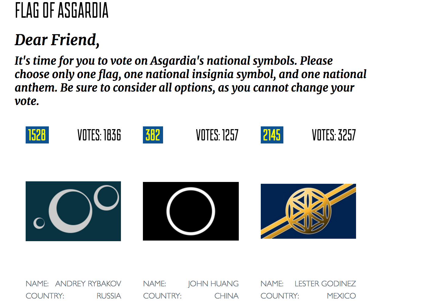 现在Asgardia已经颁布了宪法,并且邀请公民投票选出国旗和国徽。